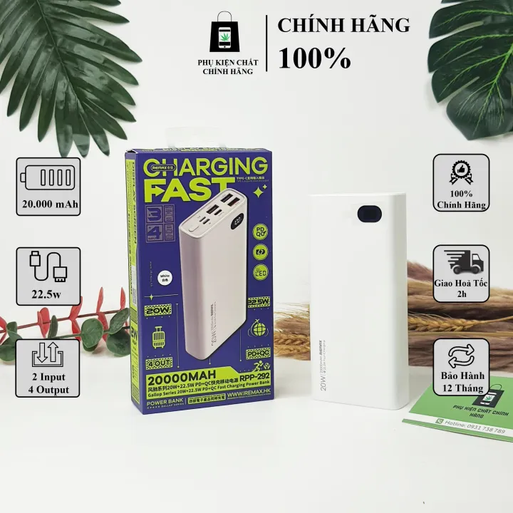 Đặc tính sản phẩm Pin dự phòng sạc nhanh Remax RPP-292 dung lượng 20000mAh QC 22.5W và PD 20W Bảo Hành 12 tháng.