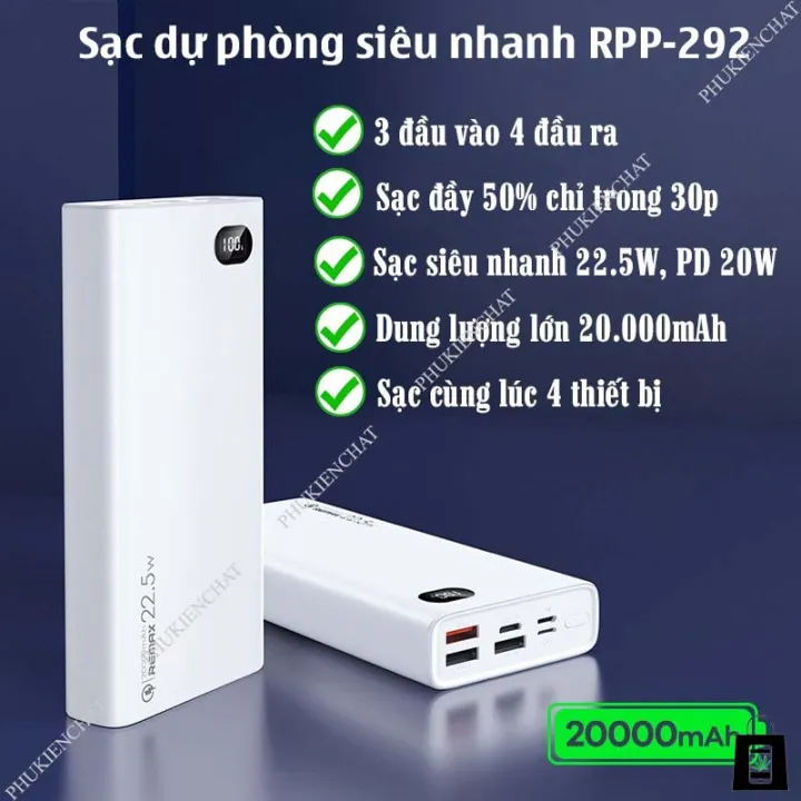 Pin sạc dự phòng Remax RPP-292 có điểm mạnh là dung lượng pin tới 20.000mAh, đảm bảo cung cấp pin cho điện thoại, máy tính bảng và các thiết bị điện tử khác khi cần thiết. Theo số liệu từ nhà sản xuất, RPP-292 có thể sạc được khoảng 4.1 lần cho iph13, 3.1 lần cho Huawei Mate 40, 2.6 lần cho Oppo Find X3 và Xiaomi 11 Pro.